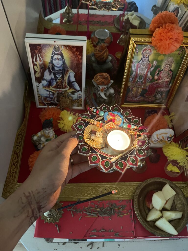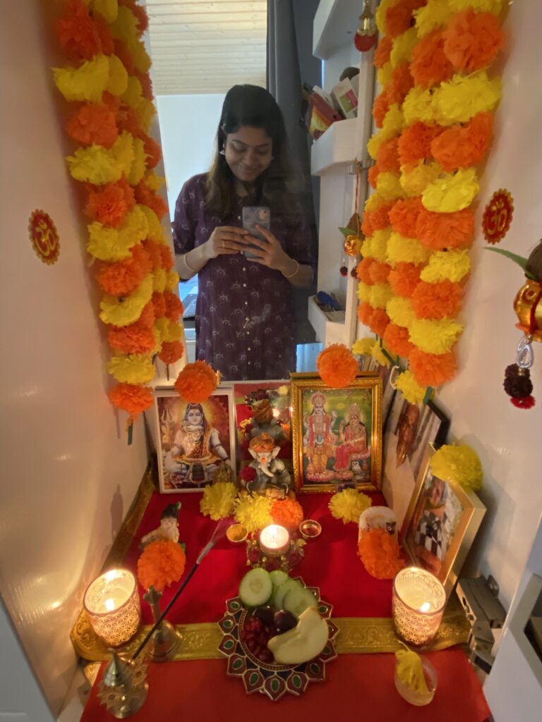 I try to do puja in a proper way during the festivals, which includes cleaning the puja space, bathing the deities, giving them prasad, lighting candles and incense sticks and offering them flowers. We have replaced candles instead of diyas to avoid any smoke or fire hazard.